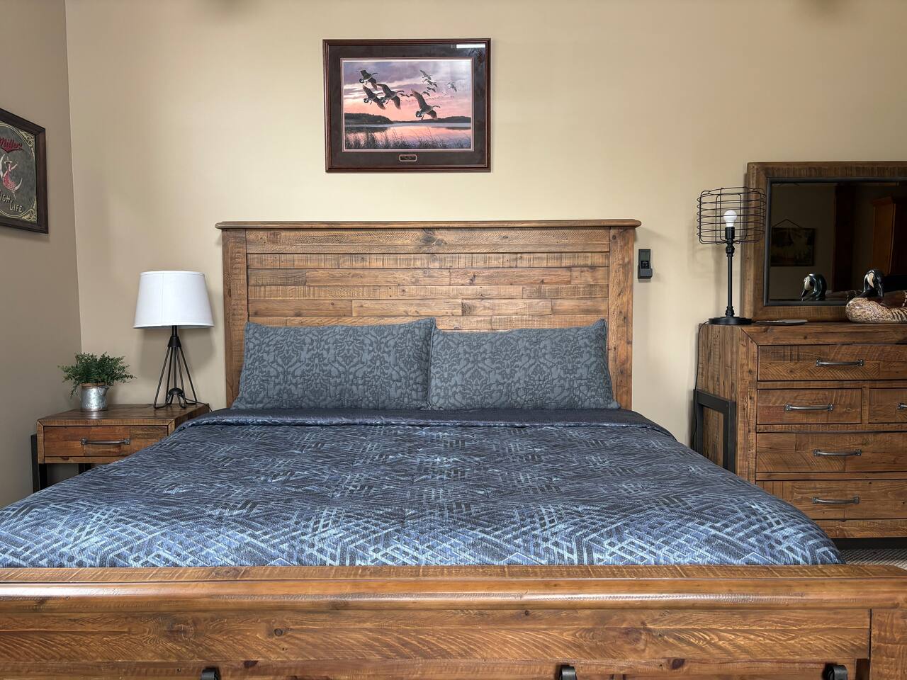 This unit features a king-size bed, which can comfortably accommodate two adults. A small child can be accommodated as well, but it may not be suitable for a third adult.